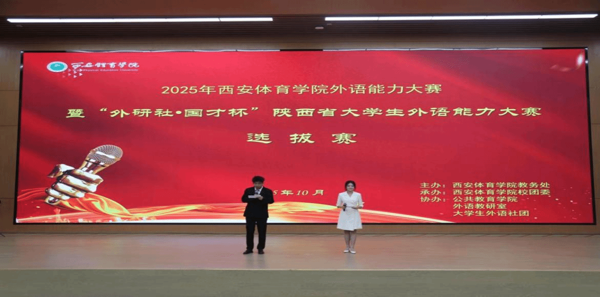 10月11日下午,2025“外研社·国才杯”陕西省大学生英语能力大赛西安体育学院选拔赛在鄠邑校区隆重举行。本次比赛由旨在选拔优秀学子晋级省赛,全面展示我校外语教学的丰硕成果,着力培养语言功底扎实、国际视野开阔的复合型体育人才。公共教育学院院领导及外语教研室全体教师的倾情参与,共同铸就了比赛的圆满成功。