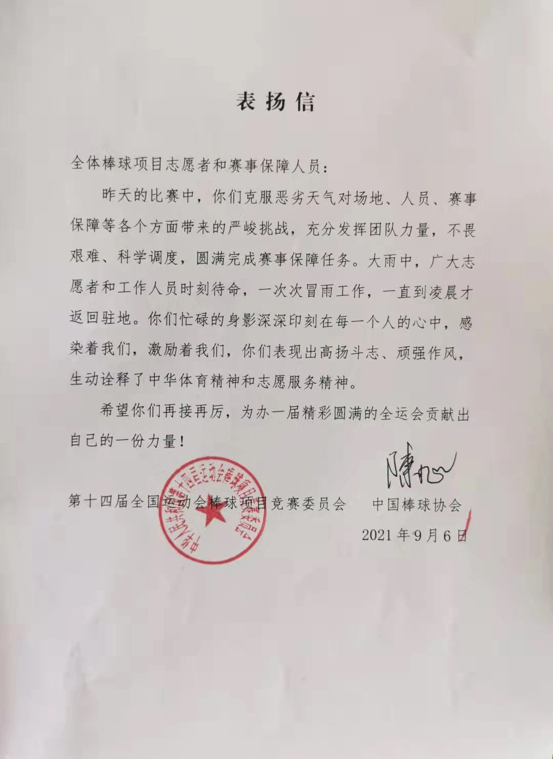 中国棒球协会在9月6日发来的表扬信中提到,9月5日的棒球比赛在大雨天气下一直持续至晚上22:40,志愿者们及工作人员充分发挥团队力量,不畏艰难,科学调度,冒雨工作,及时用海绵吸取场地的积水,直至凌晨才返回驻地,圆满完成了赛事保障工作。表扬信指出:志愿者及赛事保障人员忙碌的身影为在场的所有人留下了深刻的印象,志愿者们用高扬的斗志、顽强的作风生动诠释了中华体育精神及志愿服务精神。