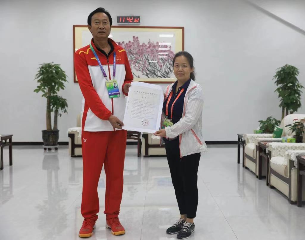 天津手球队领队贾守信与手球项目竞委会执行主任谢英合影