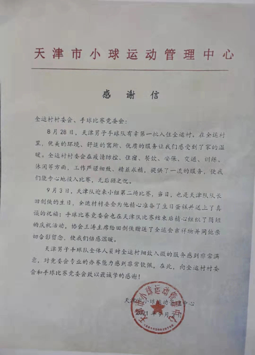 天津小球管理中心在感谢信中对手球比赛竞委会给与运动队及运动员贴心细致的服务表示诚挚的感谢。据悉,9月3日天津队小组第二场比赛当日,也是天津队队长田剑侠的生日,手球比赛竞委会为他精心布置了独具匠心的庆祝仪式,国家体育总局手曲棒垒球运动管理中心主任、中国手球协会主席王涛还给田剑侠赠送了全运会吉祥物,使他倍感温暖。感谢信中对手球比赛竞委会对运动员的关怀和专业办赛能力表达了钦佩和感谢。据悉这也是第一次有参赛代表队向竞委会发来感谢信。