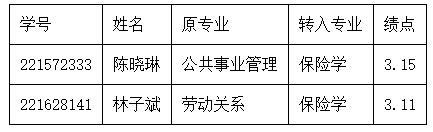 根据《广东金融学院学生管理规定》、《广东金融学院全日制本科学生转专业管理办法》、《广东金融学院2022级全日制本科生转专业实施方案》和《保险学院2022级全日制普通本科生转专业实施方案》的规定,经学生本人申请,转出学院初审,保险学院转专业工作小组对申报我院的转专业学生进行了资格审核和考察筛选,现将我院审核情况予以公示。