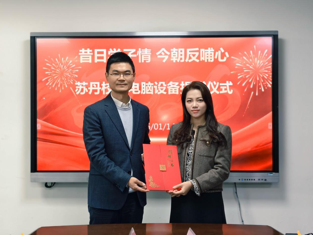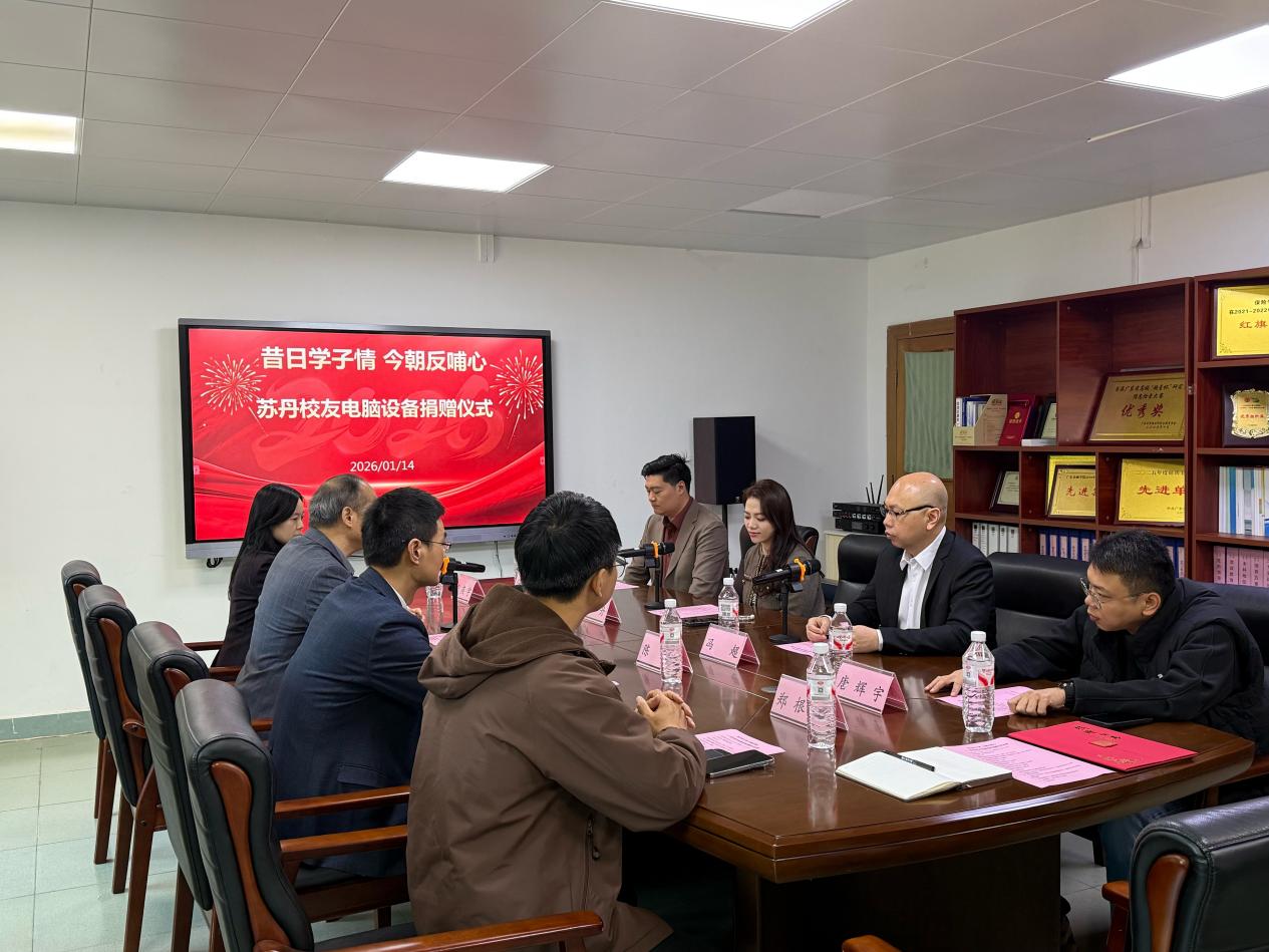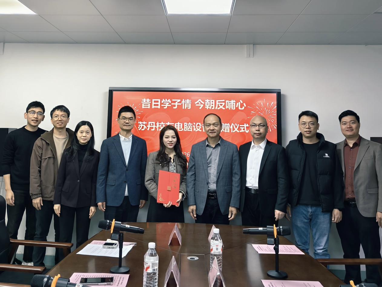 在捐赠交接环节,苏丹校友代表捐赠方亲手移交电脑设备,刘新强书记代表学院郑重接受捐赠。双方在现场合影留念,定格下这一饱含深情的时刻,每一台电脑都承载着校友对母校的眷恋与对教育事业的支持。