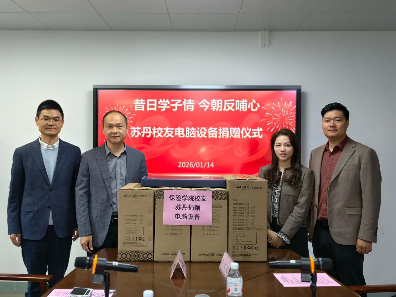 2026年1月14日上午,“昔日学子情 今朝反哺心——苏丹校友电脑设备捐赠仪式”在保险学院会议室隆重举行。本次仪式旨在搭建校友与母校的情感纽带,为学院办学质量提升提供支持。保险学院党委书记刘新强、院长陈辉、党委副书记黄燕宇、校友分会执行会长冯超、学生工作处就业工作办公室科长唐辉宇(原保险学院辅导员)、保险学院办公室负责人郑根创、辅导员陈玮鸿出席仪式,捐赠方代表——2013级校友苏丹、任文彪夫妇应邀出席,仪式由学院党委副书记黄燕宇主持。