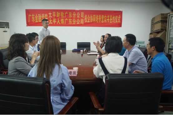 5月22日上午,广东金融学院与中国太平保险集团有限责任公司(以下简称TPIC)财险广东分公司、TPIC寿险广东分公司校企协同培养意向书签字仪式在我校举行。人寿副总经理黄志坚先生,广东金融学院王醒男副校长,人寿人力资源部负责人王宾先生,财险人力资源部负责人侯晓誉女士,人寿电商支持部副经理黄伊霞女士,人寿人力资源部吴松泽先生,财险人力资源部廖曼琪女士,保险学院党政领导班子、系主任及各班学生代表出席了签字仪式。