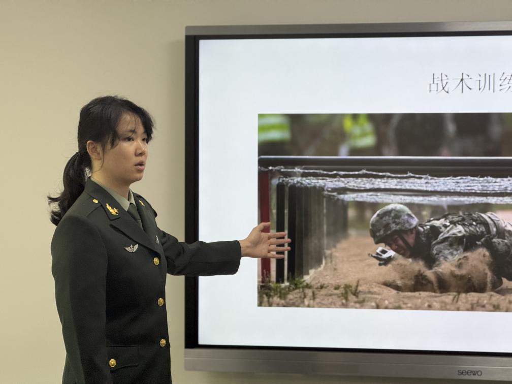 区文彦同学作为陆军通信兵的代表,她详细地讲述了从报名参军到正式入伍的全过程,包括严格的体检标准、细致的政审要求以及新兵训练期间的严苛与收获。她强调,尽管女兵的征兵名额相对有限,但只要通过坚持不懈的体能训练,充分发挥高考成绩的优势,依然有很大机会光荣入伍。最后,区文彦鼓励同学们要勇敢地 “走出舒适区,在部队遇见更好的自己”。