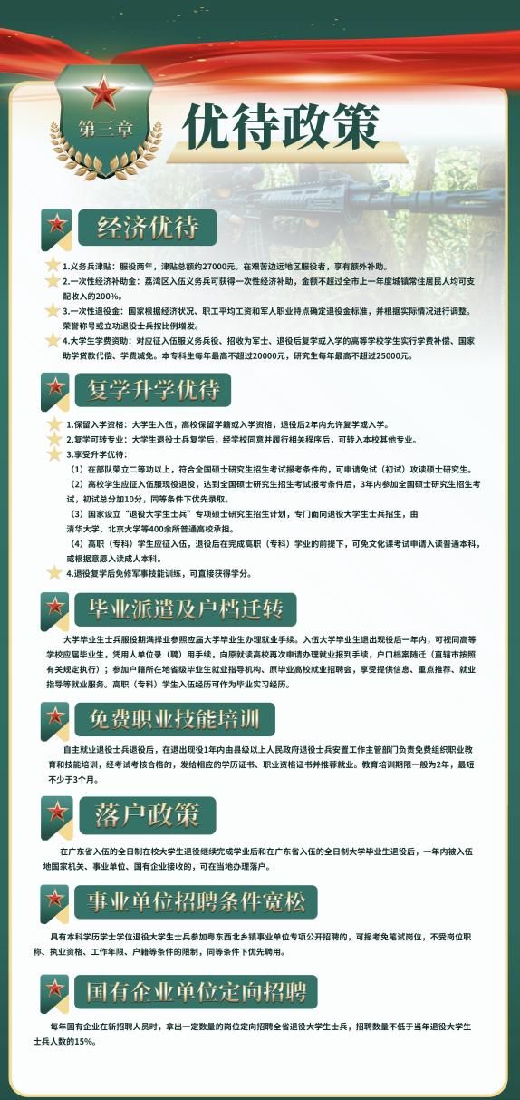 针对学生们普遍关心的学业与就业问题,武装部肖军老师进行了补充介绍。他表示,在校生入伍后可保留学籍,待退役后能够顺利继续学业,确保学业不受影响。对于毕业生而言,入伍时可优先选择兵种,并且学院与银行、保险公司等多家企业达成了 “入伍即入职” ,这为毕业生入伍后的职业发展提供了坚实保障。活动现场还设置了自由问答环节,学生们踊跃提问,武装部老师认真倾听每一个问题,并逐一进行了耐心细致的解答。以下是入伍有关政策。