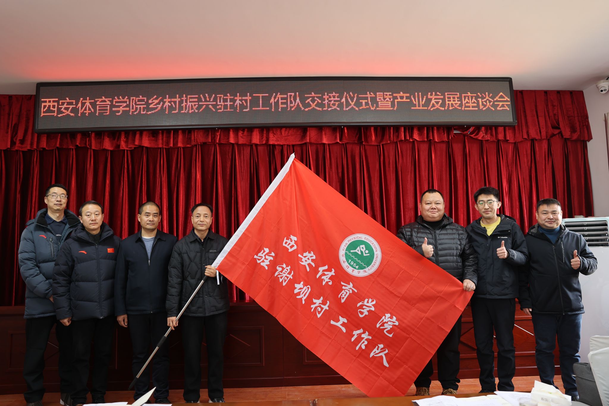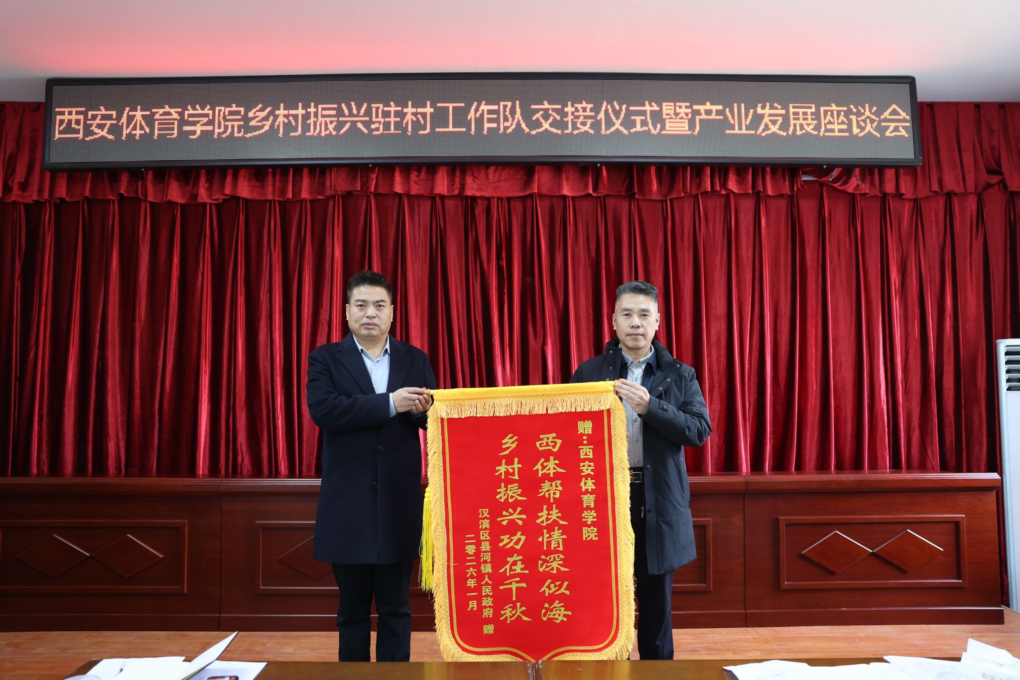 交接仪式上,县河镇为西安体育学院和谢坝村驻村工作队员颁发了锦旗和特殊贡献奖证书,谢坝村也为驻村工作队员赠送了锦旗,以表达对他们辛勤付出的感激之情。随后,谢坝村新老驻村工作队进行了队旗交接,标志着新一轮驻村工作正式拉开序幕。
