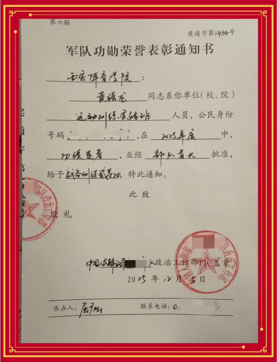 近日,中国人民解放军某部队政治工作部向我校发来荣誉表彰通知书,对我校体育教育训练学院运动训练专业实验班2019级学生黄强龙入伍后的优异表现给予高度肯定和表彰。