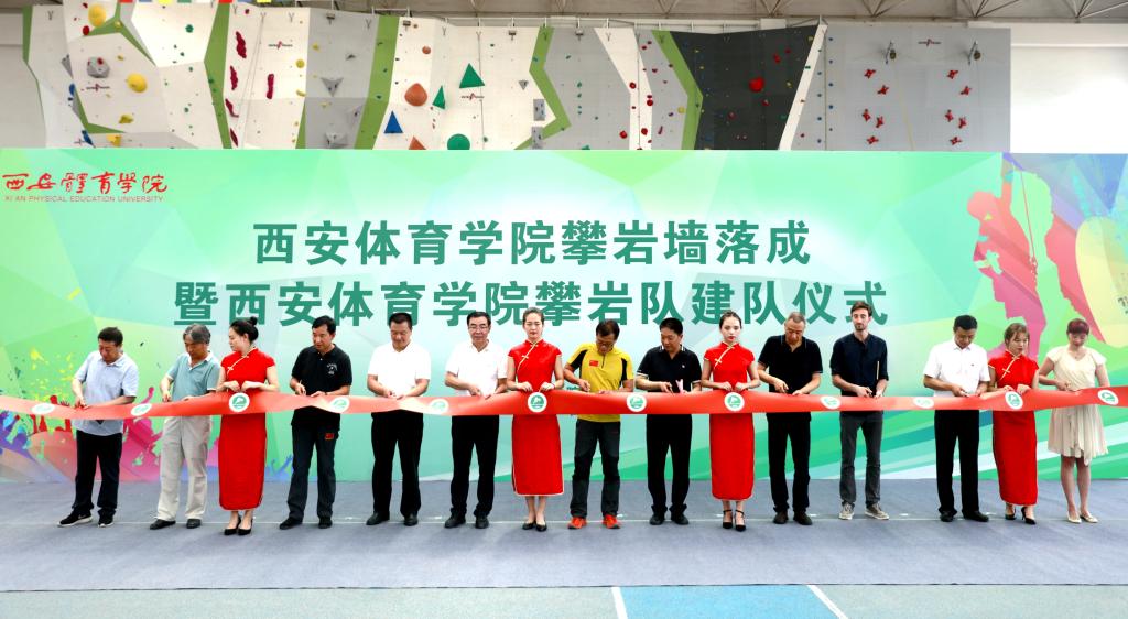 本网讯  7月2日上午,我院举行攀岩墙落成暨院攀岩队建队仪式。国家体育总局登山运动管理中心攀岩奥运备战办主任、中国登山协会副秘书长罗申,我院院长朱元利,省体育局副巡视员陈波,我院副院长陈彦,省登山运动协会主席陈铮,全国大学生体育协会攀岩分会户外运动部主任师长青、承建方意大利籍设计师Ale,以及学院相关部门负责人,教师代表、学生代表、我市攀岩体育产业从业人员和攀岩爱好者共200余人参加了本次活动。