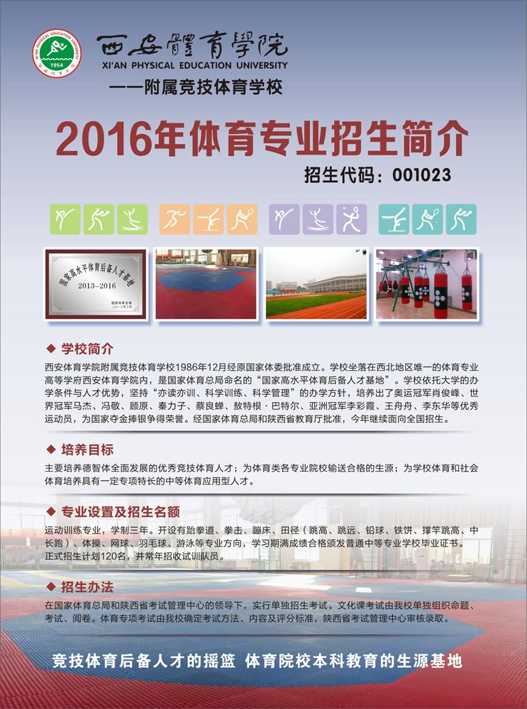 西安体育学院竞技运动学院 西安市碑林区含光北路65号 邮编:710068 联系电话:029-88409750