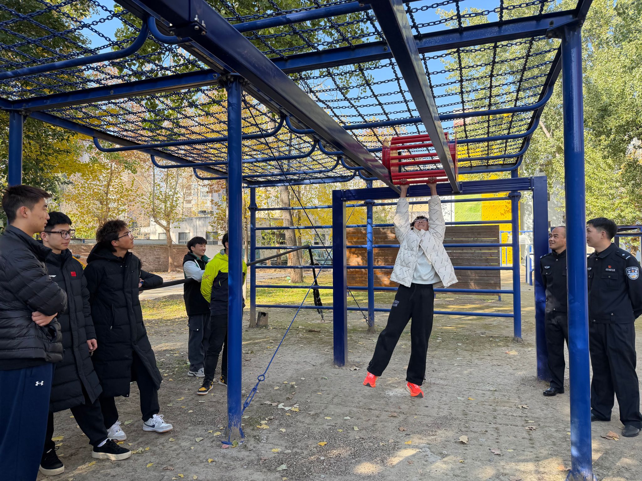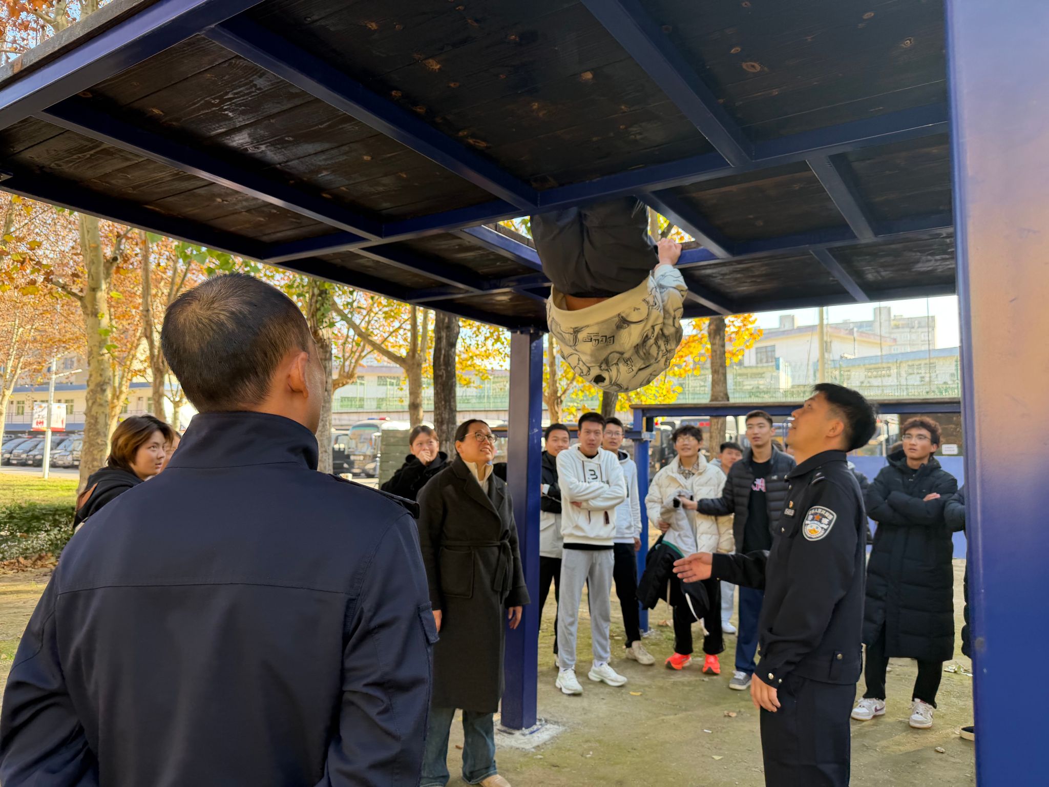紧接着是备受期待的体验环节。同学们被带领至越障训练场,在特警队员的专业指导和保护下,部分学生勇敢地尝试了跨越障碍等项目。尽管只是初步体验,但特警日常训练的高难度与高强度已让同学们有了切身体会,对特警队员的体能和技能水平赞叹不已。