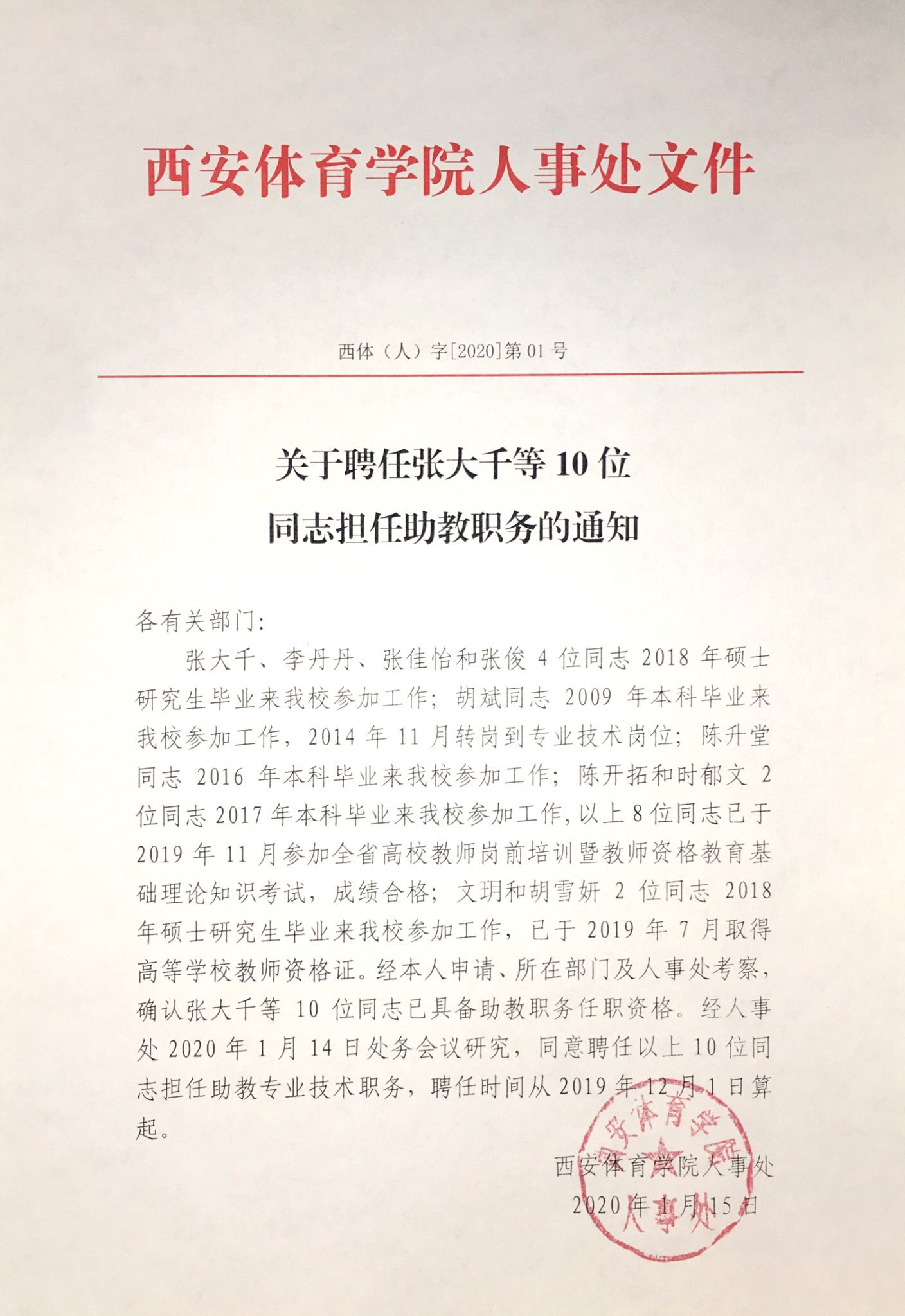 关于聘任张大千等10位同志担任助教职务的通知