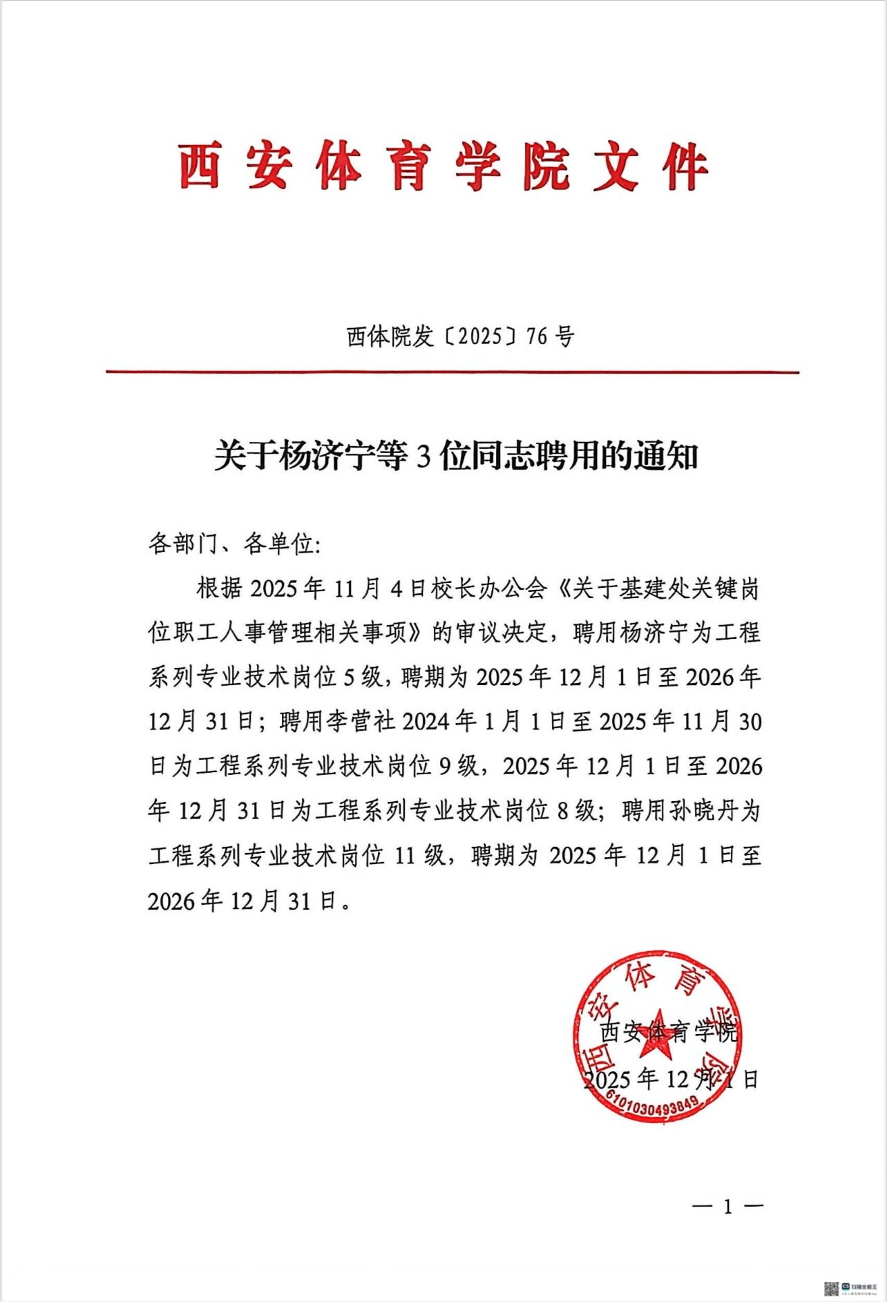 关于杨济宁等3位同志聘用的通知