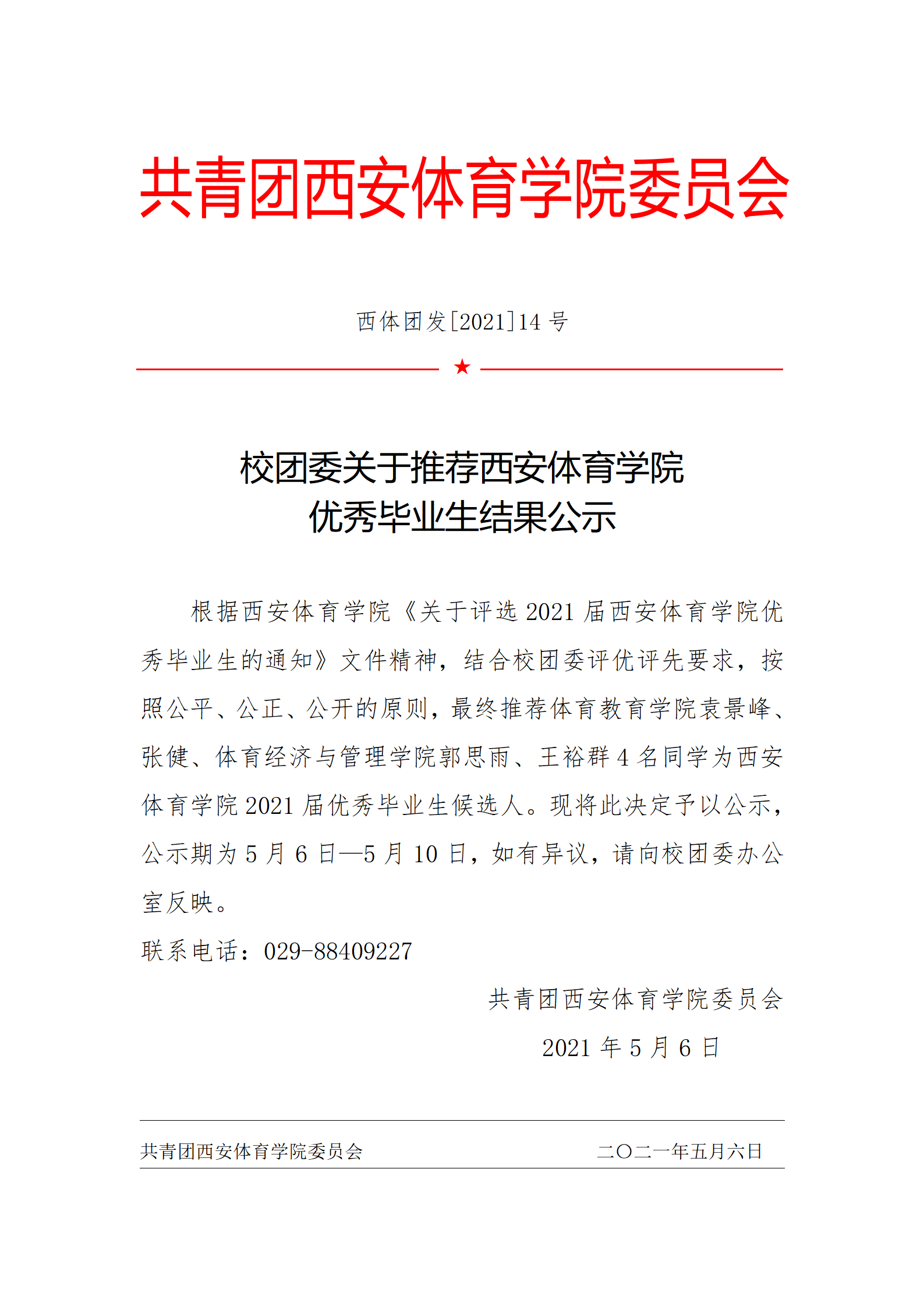 校团委关于推荐西安体育学院优秀毕业生结果公示