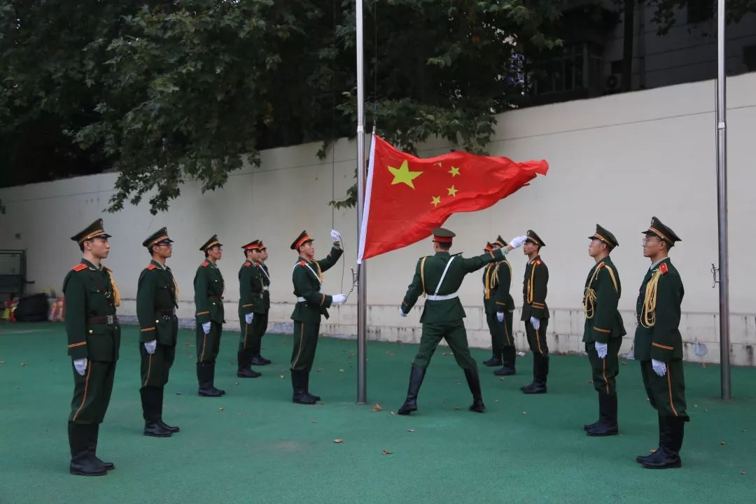 7时整,仪式正式开始,学校国旗护卫队升旗方队戎装齐整、口号嘹亮、步伐铿锵,迈向国旗台。全体师生在学校运动场面向国旗台肃立致敬。伴随着全体师生嘹亮的国歌声中,鲜艳的五星红旗冉冉升起,高高飘扬。