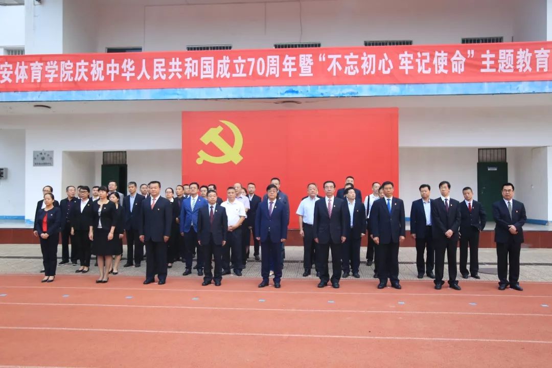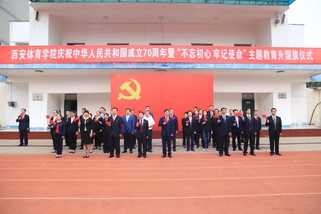 为庆祝中华人民共和国成立70周年,深入开展“不忘初心、牢记使命”主题教育,歌唱新时代奋斗主旋律,弘扬师生的爱国精神,我校于2019年10月1日早7:00在第一田径场举行庆祝中华人民共和国成立70周年暨“不忘初心、牢记使命”主题教育升旗仪式。西安体育学院校领导、各二级党委书记、校团委全体成员、学工部、各单位主要负责人、全体辅导员、二级学院教师代表、学生代表、近两年发展的70名党员参加了升旗仪式,升旗仪式由校长朱元利主持。
