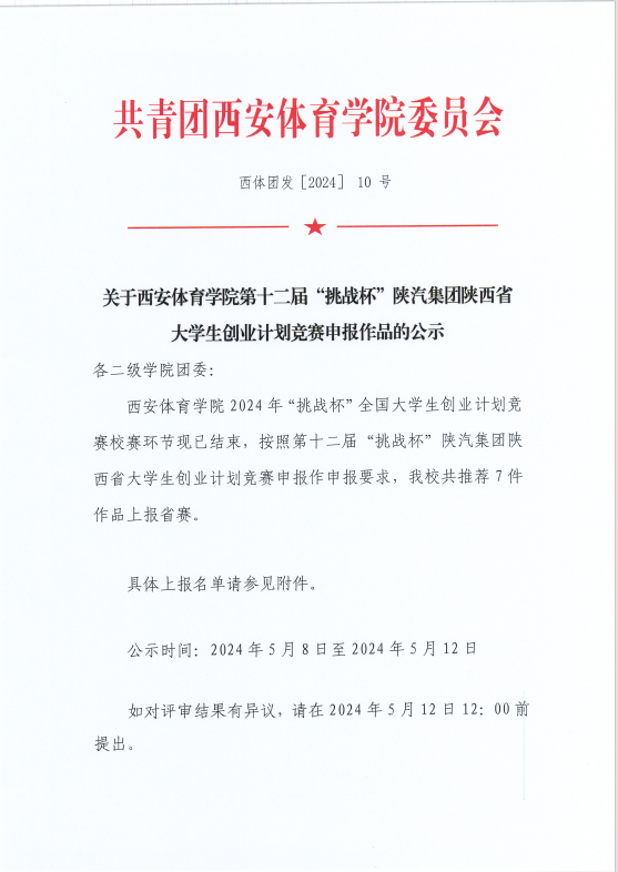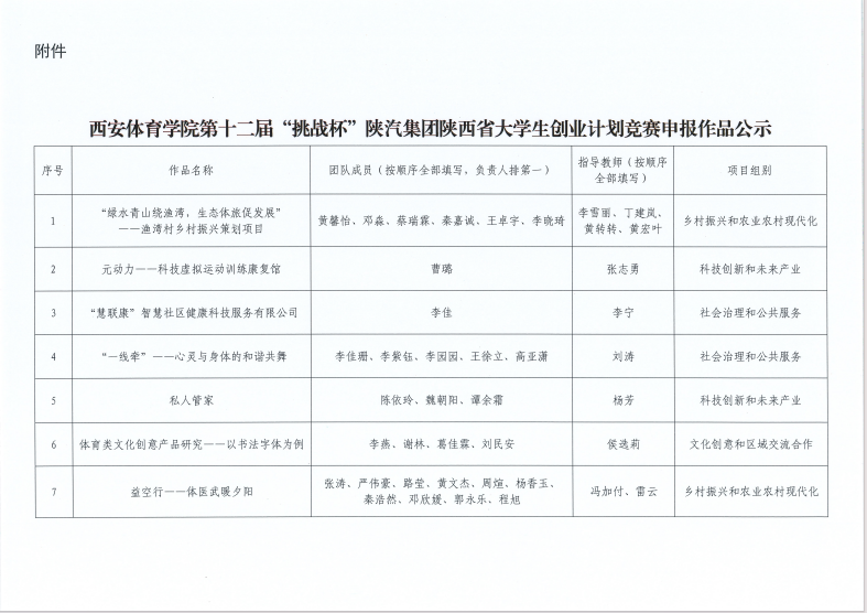 关于西安体育学院第十二届“挑战杯”陕汽集团陕西省大学生创业计划竞赛申报作品的公示