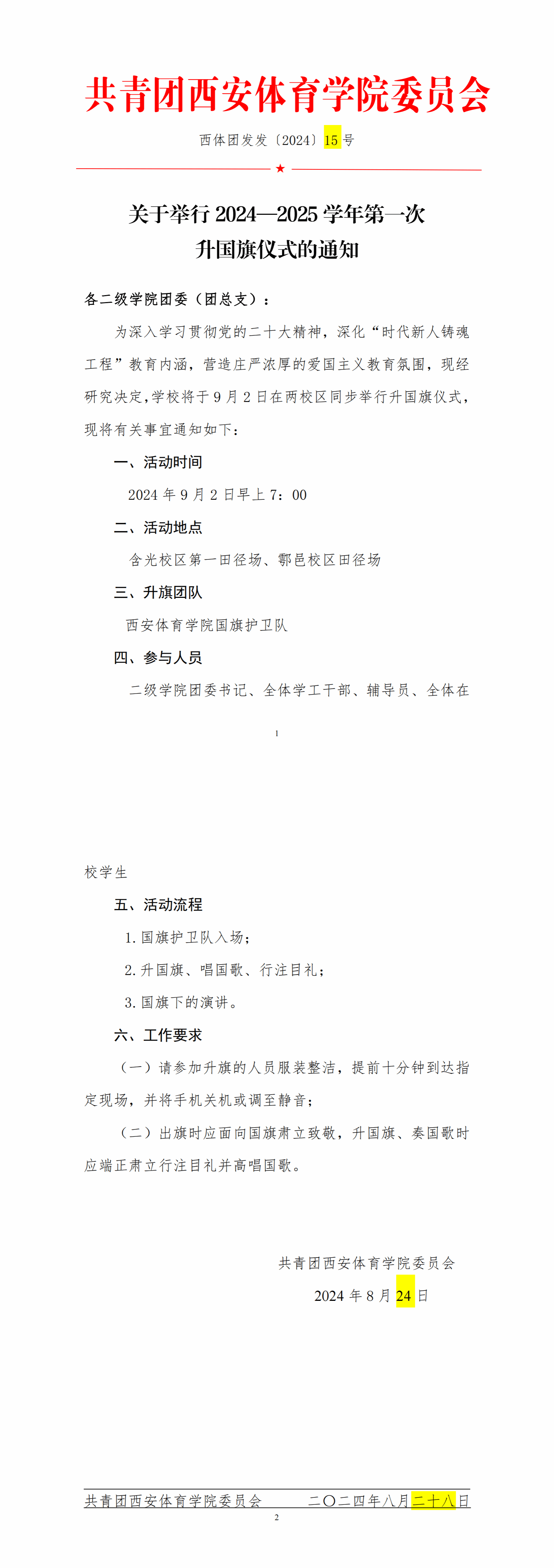 关于举行 2024—2025 学年第一次 升国旗仪式的通知