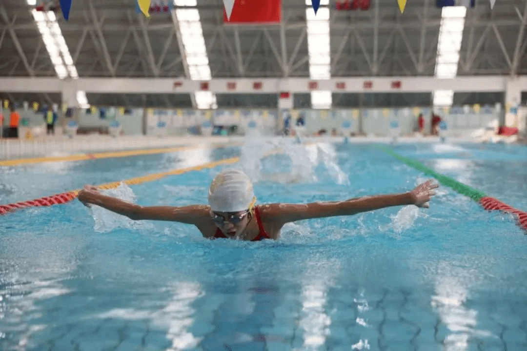 蛙泳、自由泳,泳池竞技斗志昂扬。