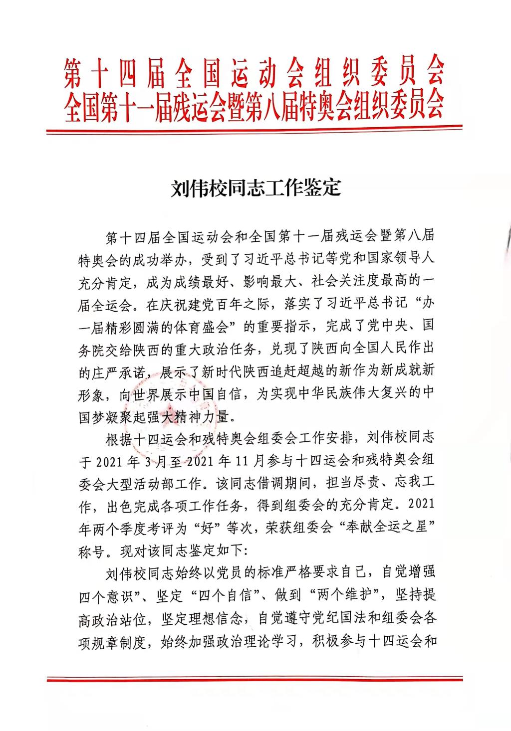 根据十四运会和残特奥会组委会工作安排,我院刘伟校老师于2021年3月至2021年11月参与十四运会和残特奥会组委会大型活动部工作。刘伟校老师借调期间,担当尽责、忘我工作,出色完成各项工作任务,得到组委会的充分肯定。 2021年两个季度考评为“好”等次,荣获组委会“奉献全运之星”称号。