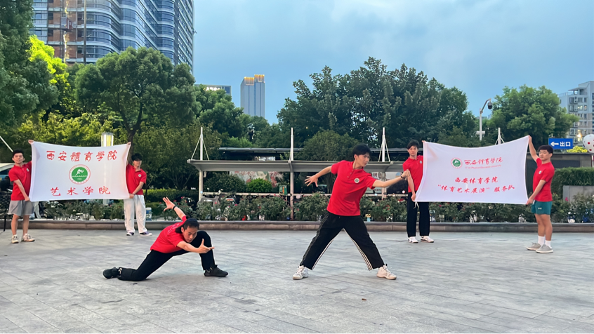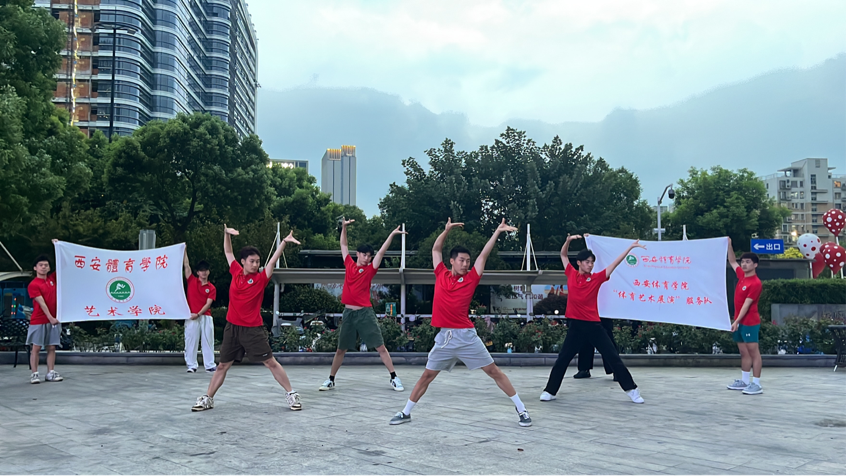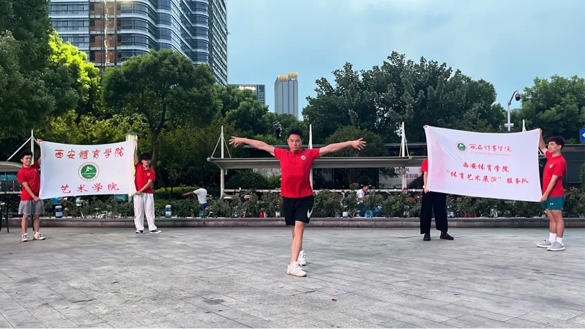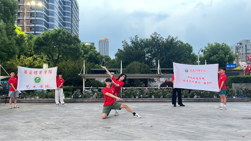 8月中旬西安体育学院艺术学院大学生艺术表演团在浙江省杭州市宝龙城市广场进行义演。这支队伍为杭州第十九届亚运会演员志愿者,他们作为西体学子和三下乡社会服务队的参与人员,身兼数职,不辞辛劳。通过精心准备的文艺节目,向热情的杭州人民展示西体青年学子的舞蹈风采。