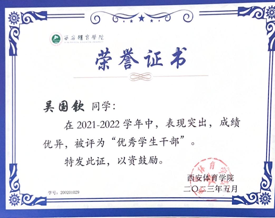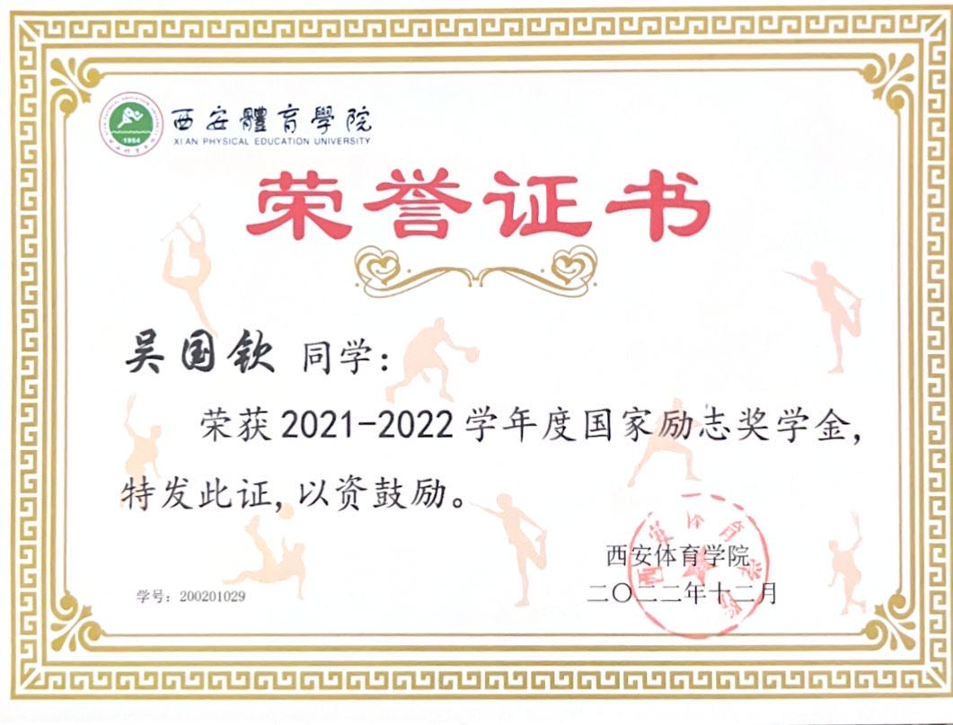 吴国钦,汉族,海南儋州人,生于2001年5月,运动训练专业2020级学生,曾获国家奖学金、国家励志奖学金等荣誉。