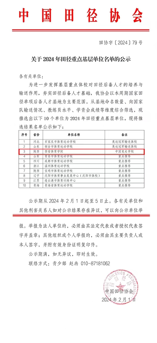 本网讯 近日,中国田径协会公布2024年田径重点基层单位名单,我校“中国竞走学校”位列其中。此次评选是中国田径协会以本周期国家田径单项后备人才基地为重要范围,从基地命名数量、向国家队输送情况、教练员水平、学青会成绩等维度综合筛选结果,共评选出10家单位。