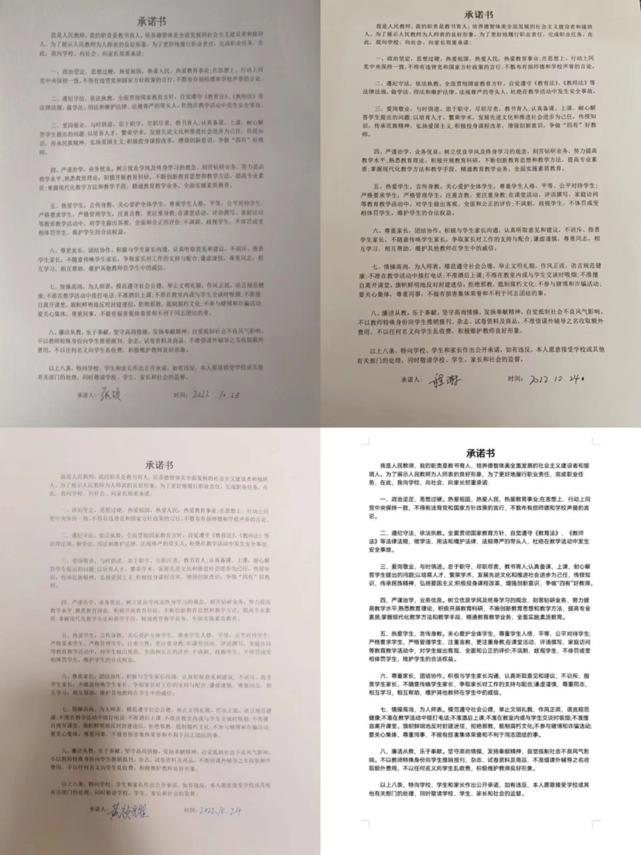 党的二十大报告提出要“办好人民满意的教育”,并对“加强师德师风建设,培养高素质教师队伍”作出明确要求。习近平总书记指出:“培养社会主义建设者和接班人,迫切需要我们的教师既精通专业知识、做好‘经师’,又涵养德行、成为‘人师’,努力做精于‘传道授业解惑’的‘经师’和‘人师’的统一者。”师德是立教之本,兴师之源。此次教师师德师风承诺活动的开展,切实增强了教育工作者的责任感和使命感。教职工们纷纷表示,将坚持用德与学生相伴、用情与教育相携、用实际行动践行誓词承诺,不忘初心,牢记从教使命,执着耕耘,砥砺前行,以昂扬向上的精神面貌和立德树人的扎实行动,践行二十大报告中对教师的要求。