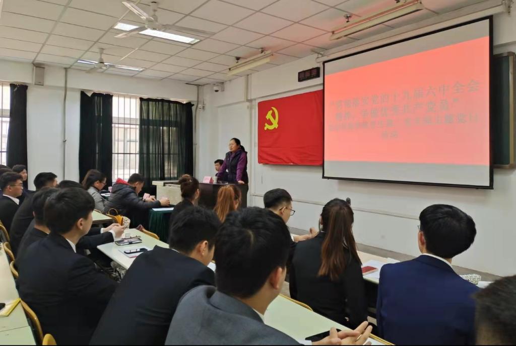 全体党员教师以及学生第二党支部的党员、预备党员和入党积极分子一同观看学习了十九届六中全会重要指示精神纪录片,观看结束后,全体人员进行了重温入党誓词的庄严的宣誓活动。