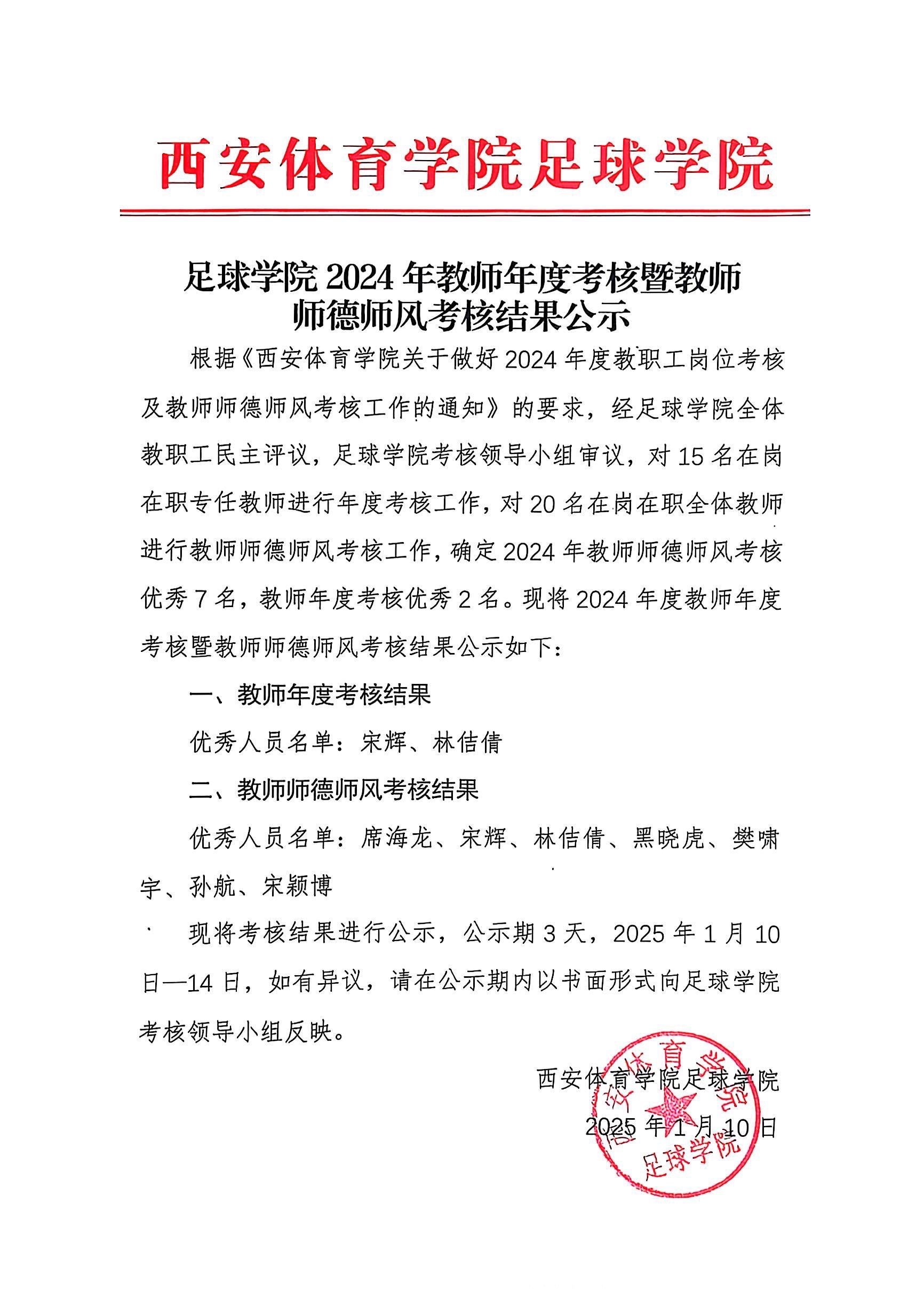 足球学院2024年教师年度考核暨教师师德师风考核结果的公示