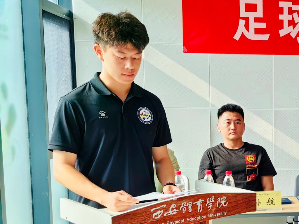 最后,与会教师为新生代表佩戴西安体育学院校徽,希望全体足院学生秉承“严谨 创新 团结 拼搏”的校训,争做新时代西体人。